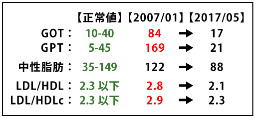 長い間、GOTやGPT、中性脂肪、コレステロールなどの数値が、危険水域或いは正常値超えとなっていた。